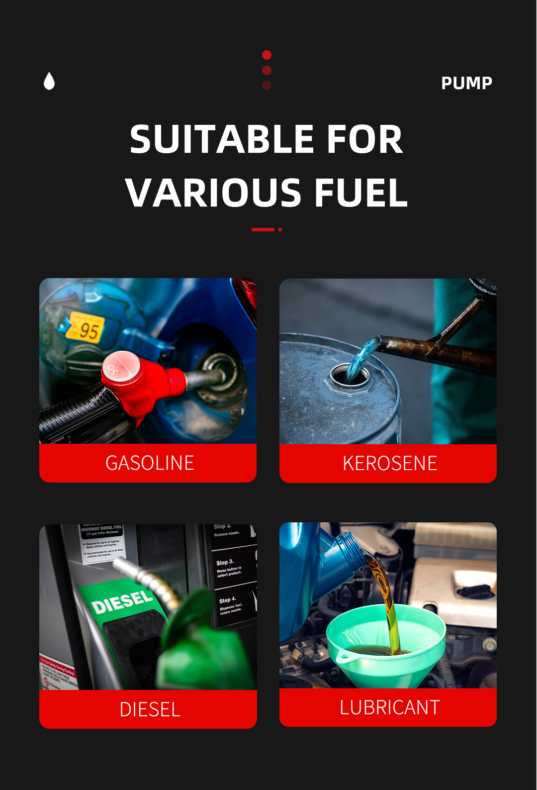 Compatible Fluids: Gasoline, Kerosene, Light Oil, and Type A/B/C Crude Machine Oil.